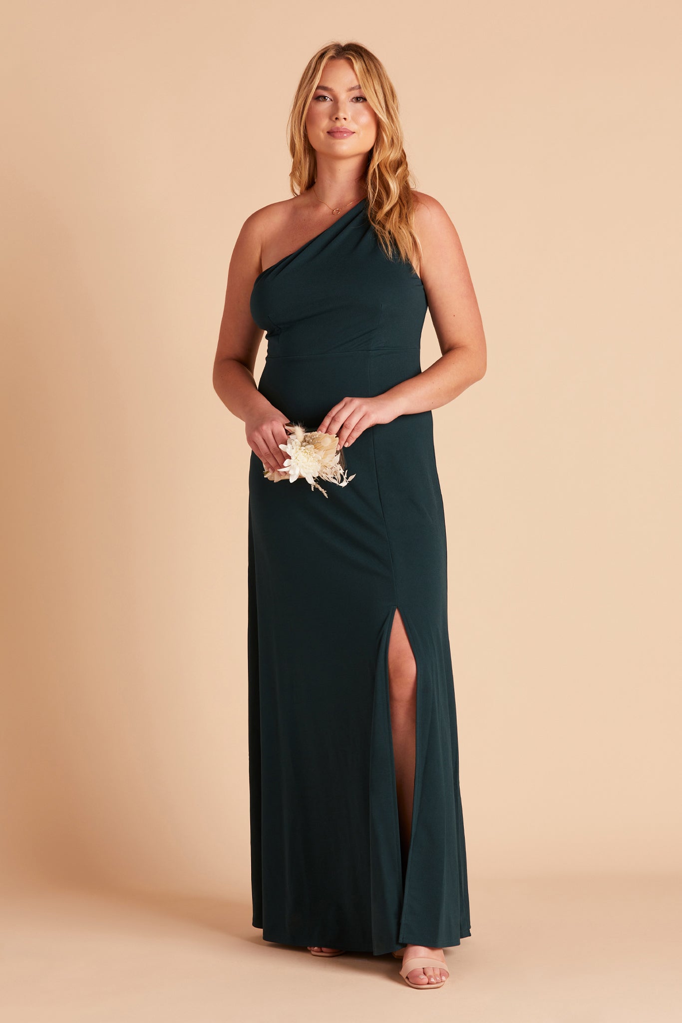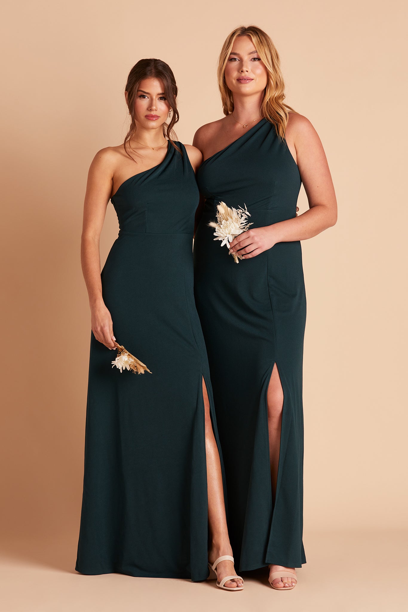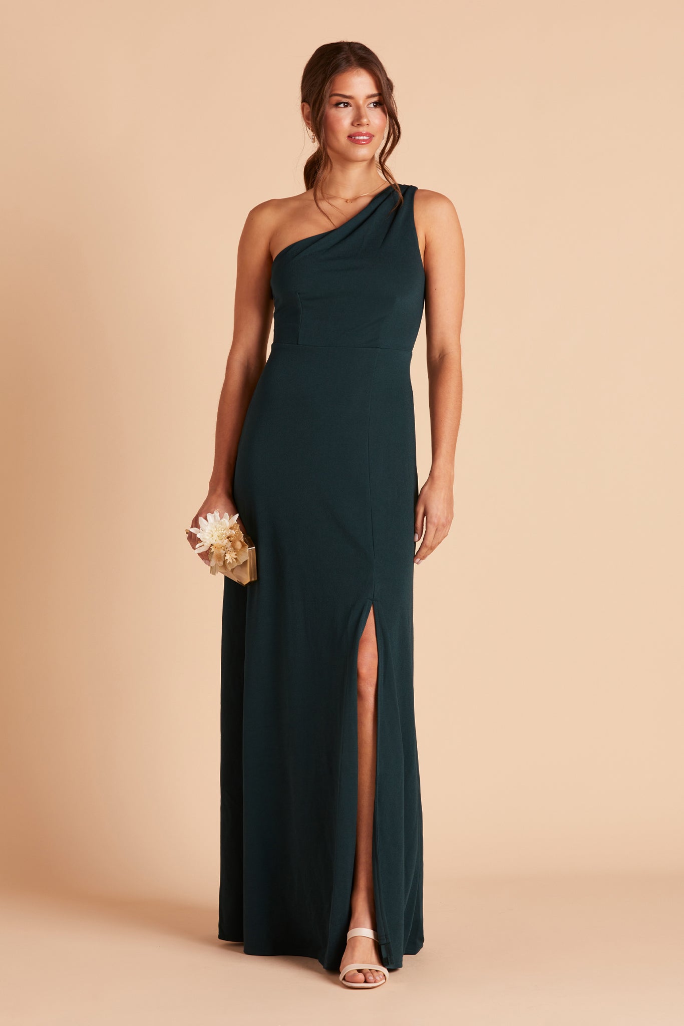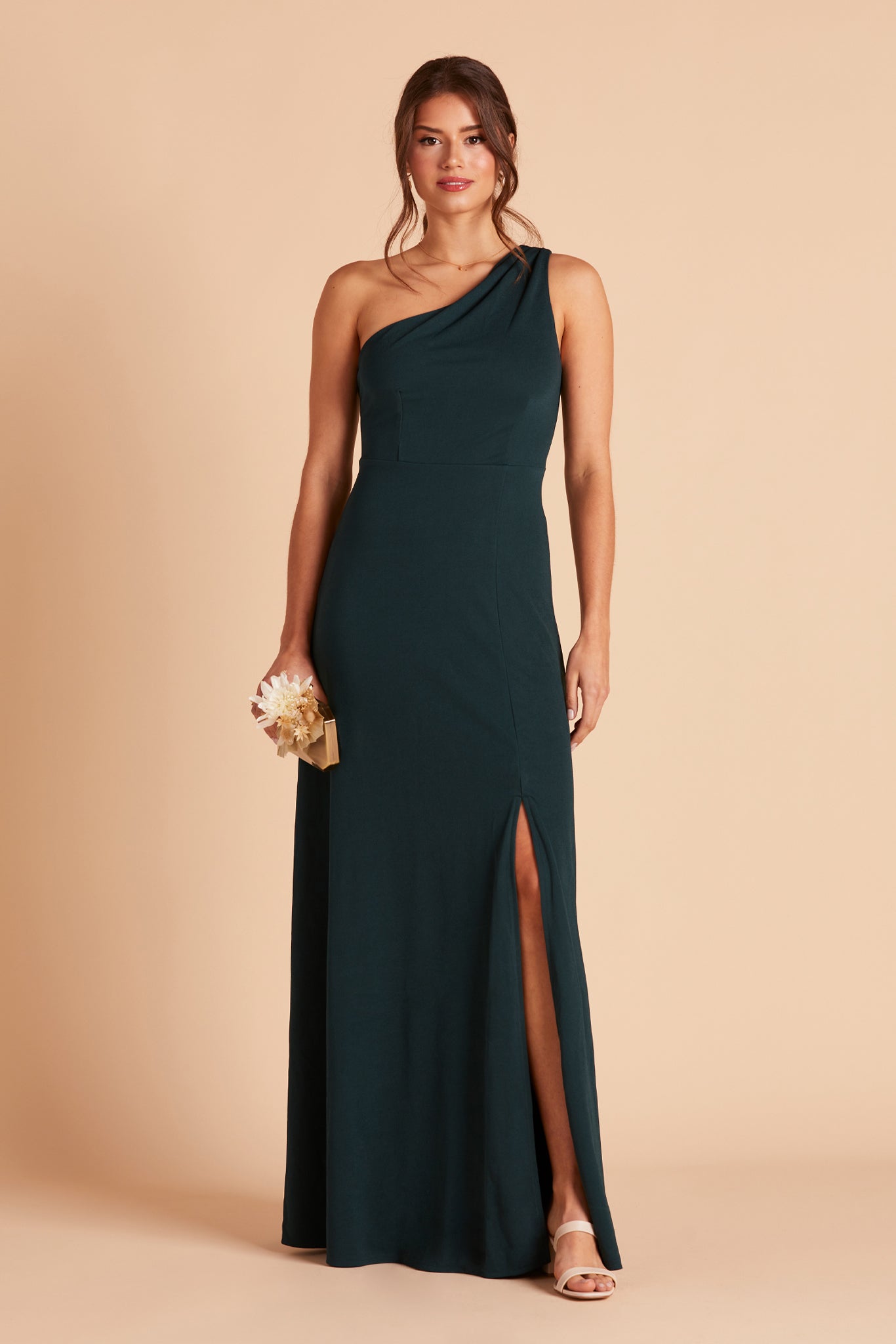 We love a good goddess vibe and this crepe bridesmaid dress does it a newfangled way thanks to our stretchy performance fabric. This one-shoulder bridesmaid dress features soft pleating that fades out at the top of the chest, giving off a proper ladylike vibe and makes for a stellar choice for bridesmaids who tend toward a modest look.