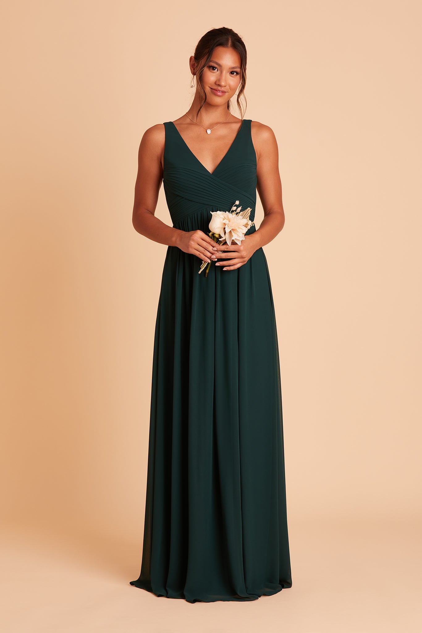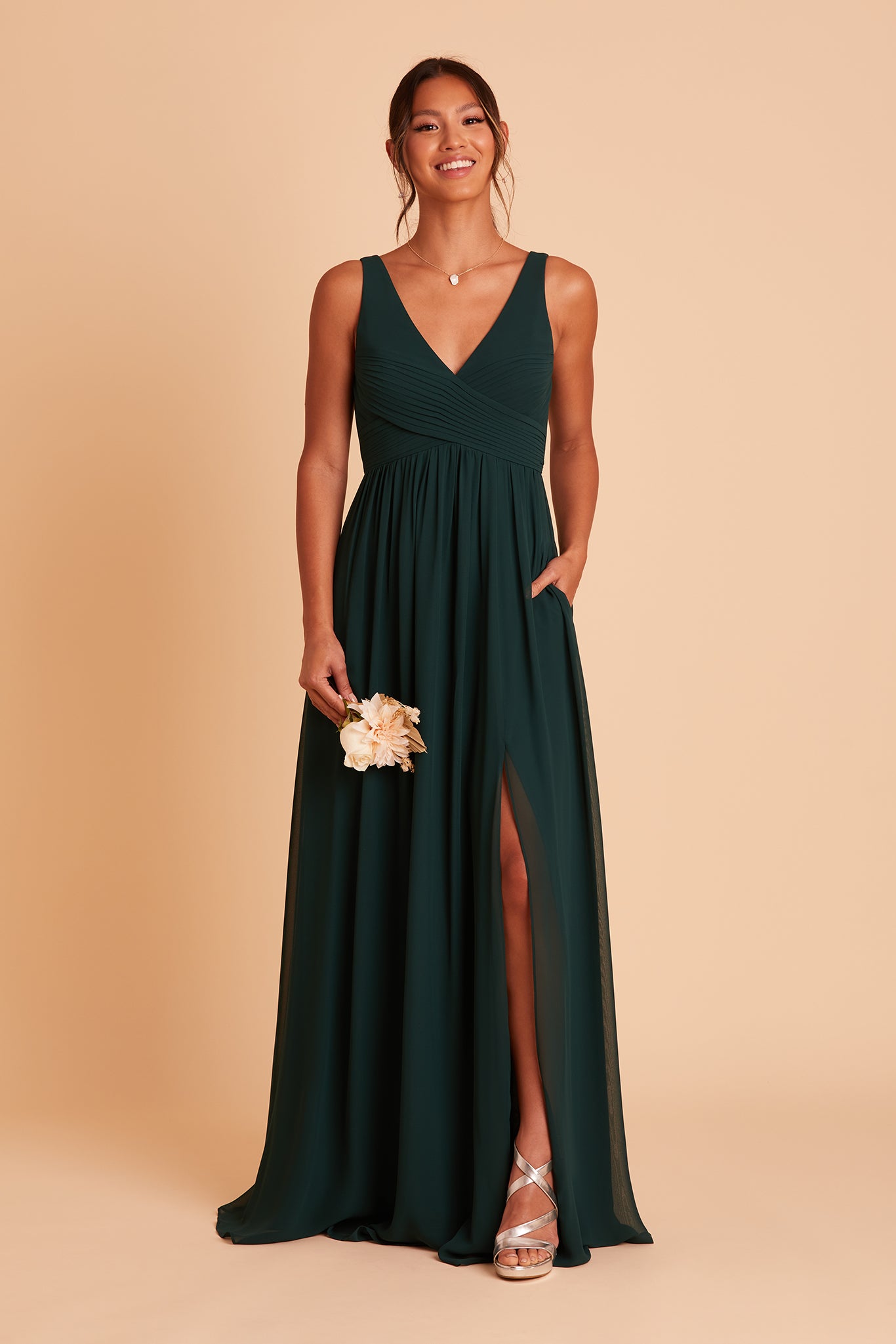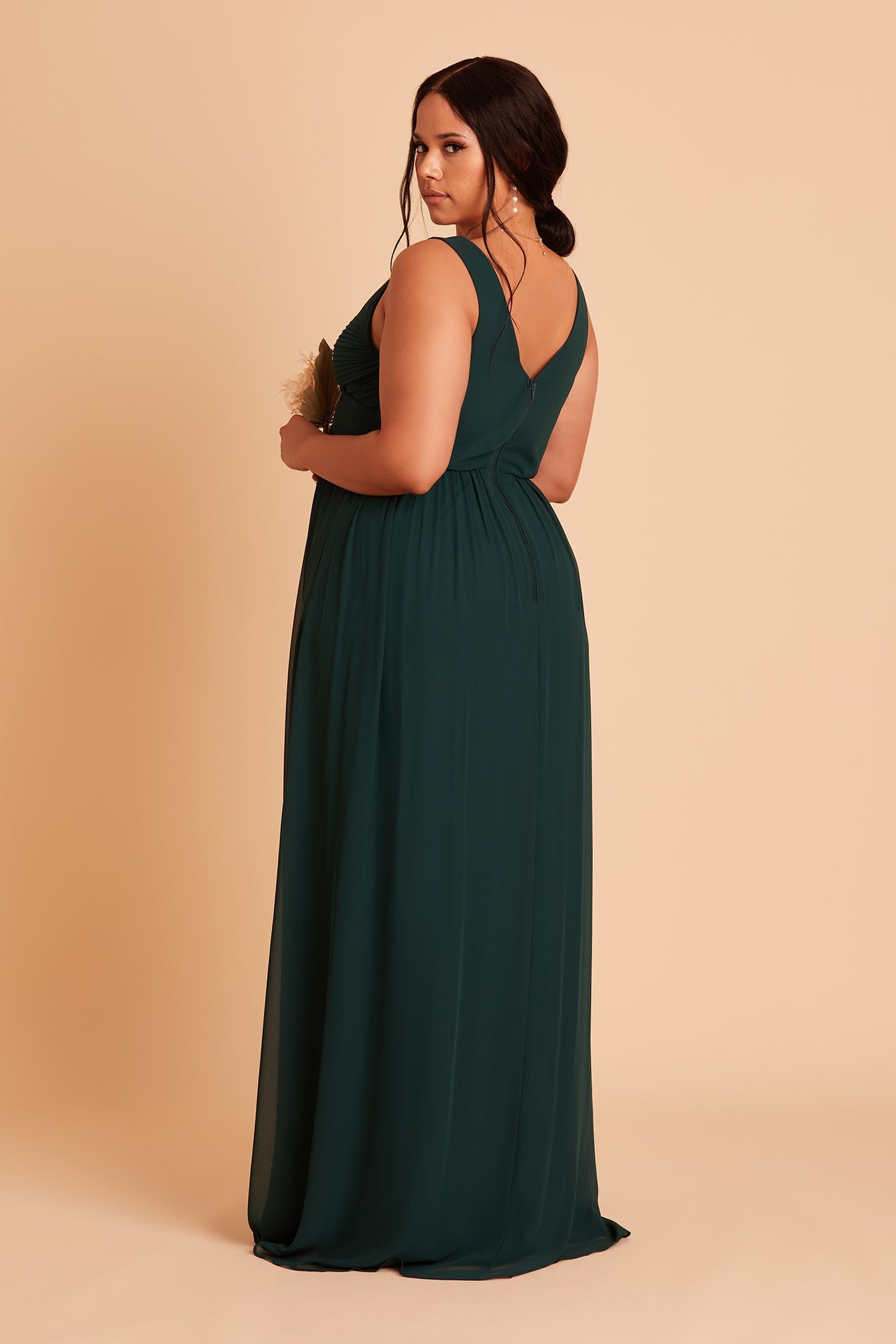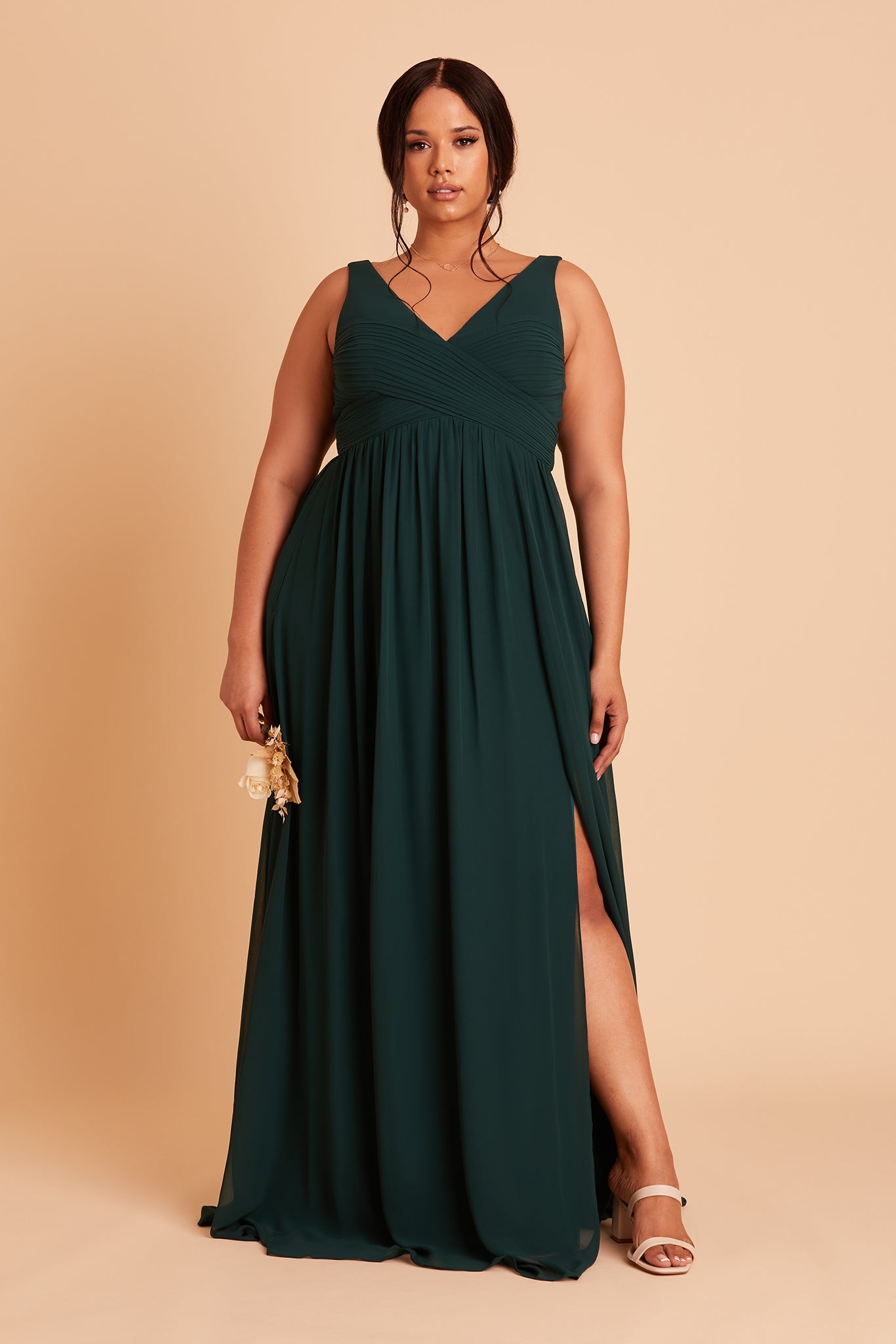 Pretty ✔ Classy ✔ Comfy ✔ This floor-length sleeveless chiffon bridesmaid dress has a raised empire waist which means it's not only perfect for someone who wants some extra breathing room (while looking long & lean), it also doubles as a maternity bridesmaid dress for expecting moms with a growing baby bump. The bodice features beautiful pleating and because everyone can use a little bit of sex appeal while keeping things classy, we also added a slit for a flash of leg.