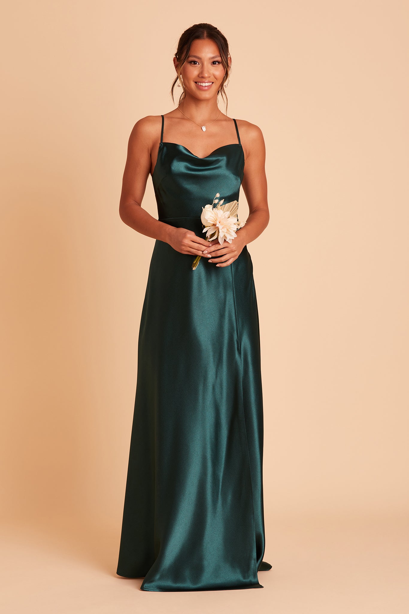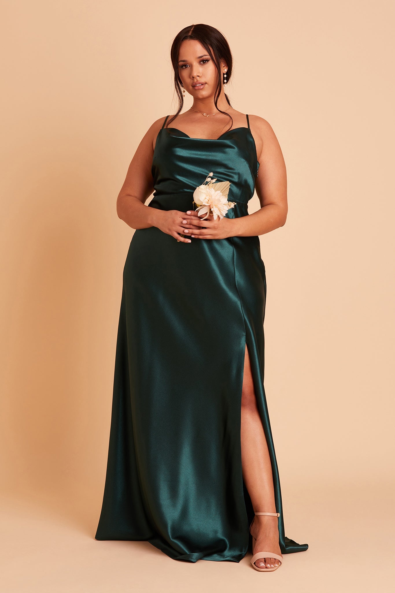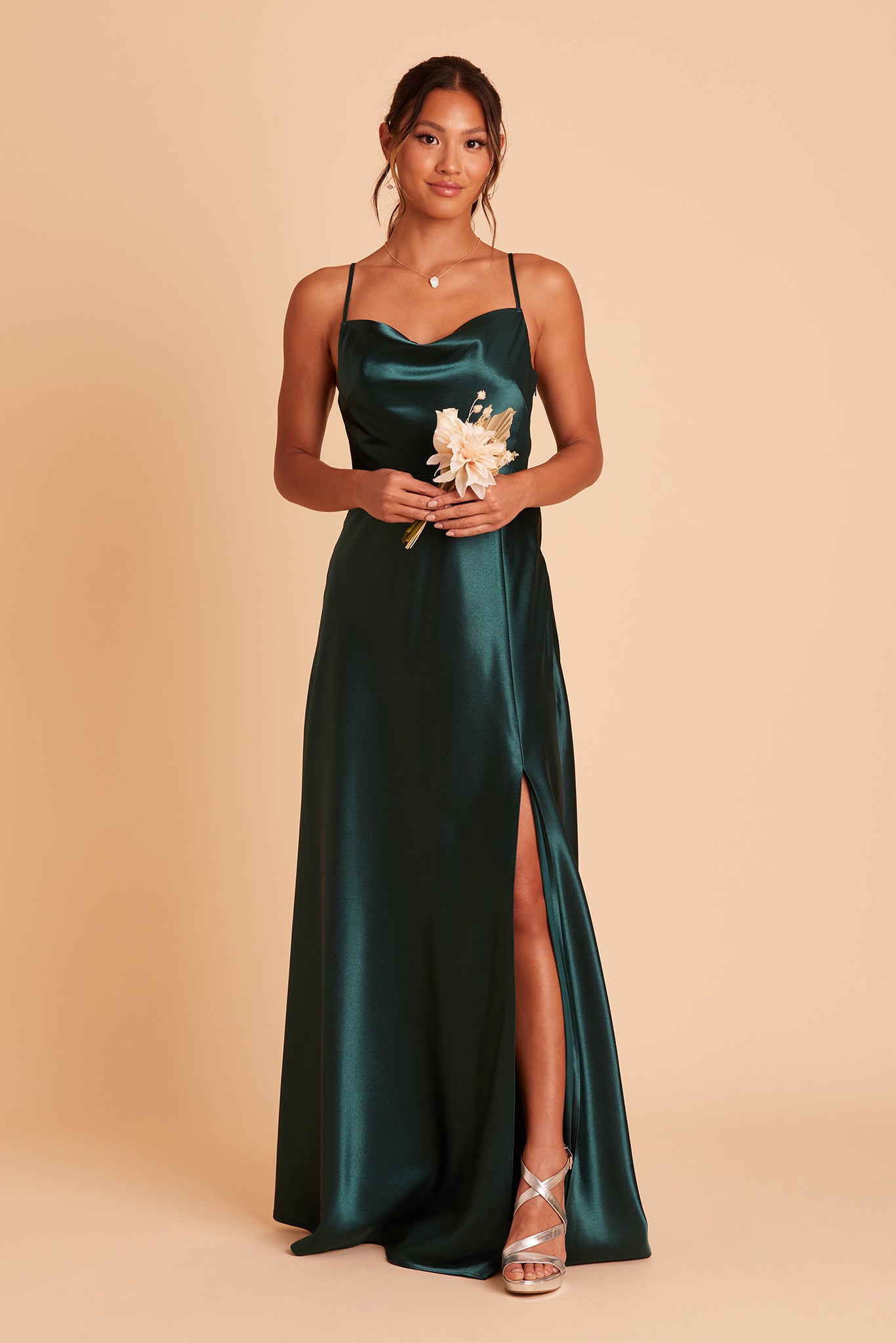 If our Lisa Satin Midi is the young, fun-loving sister, this floor-length one is the elegant, grown-up sis. She still flaunts the same signature '90s cowl neck, but this Lisa is a head-turning statuesque beauty. We see this satin bridesmaid dress paired with a chic little clutch, and a dainty pearl necklace to accentuate your collarbone.