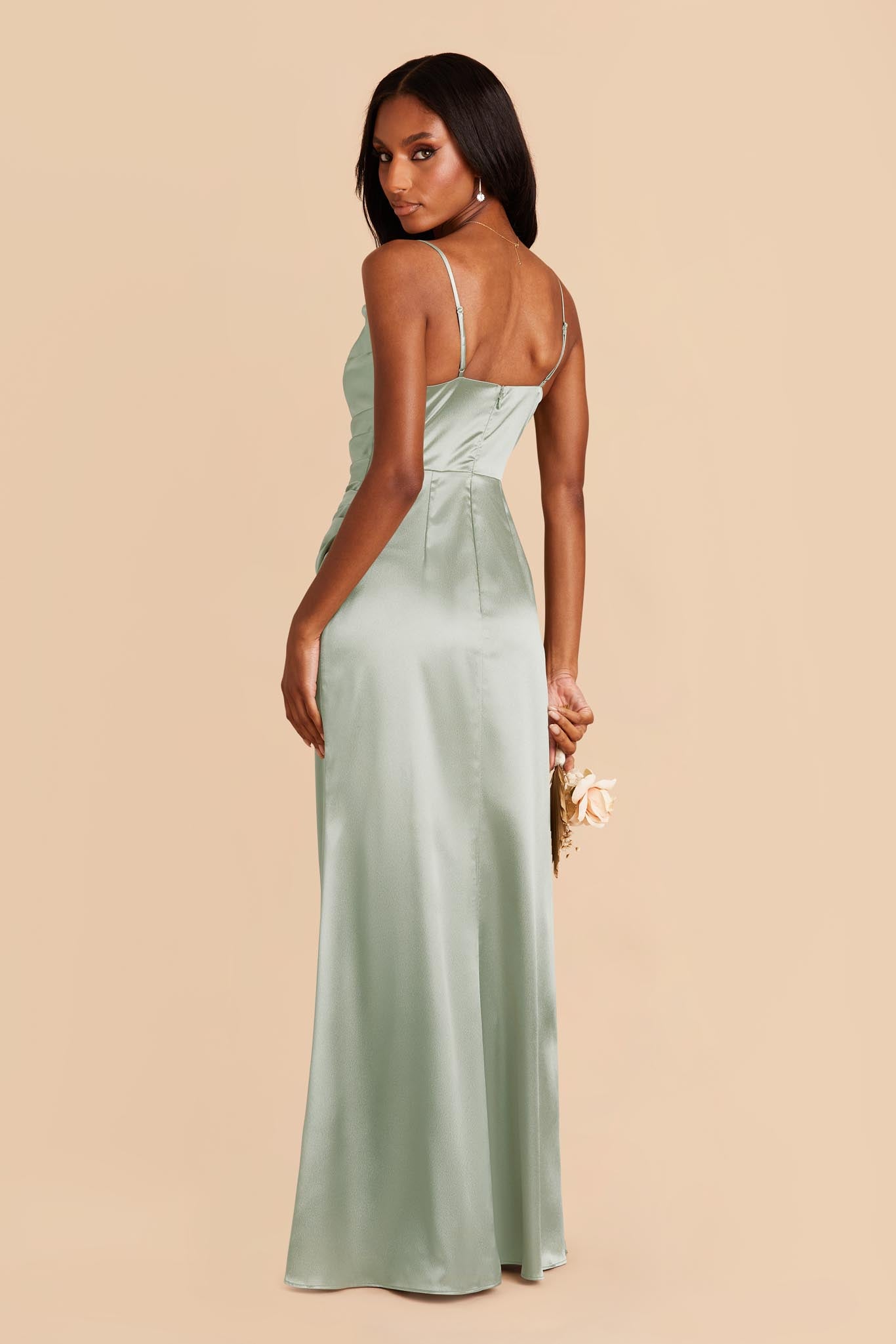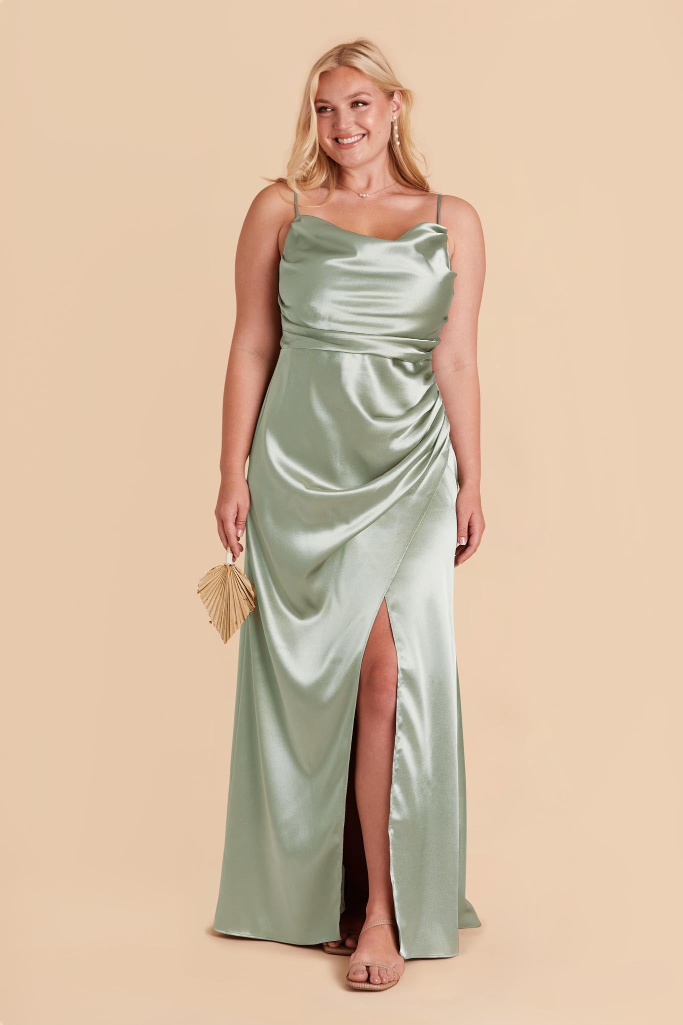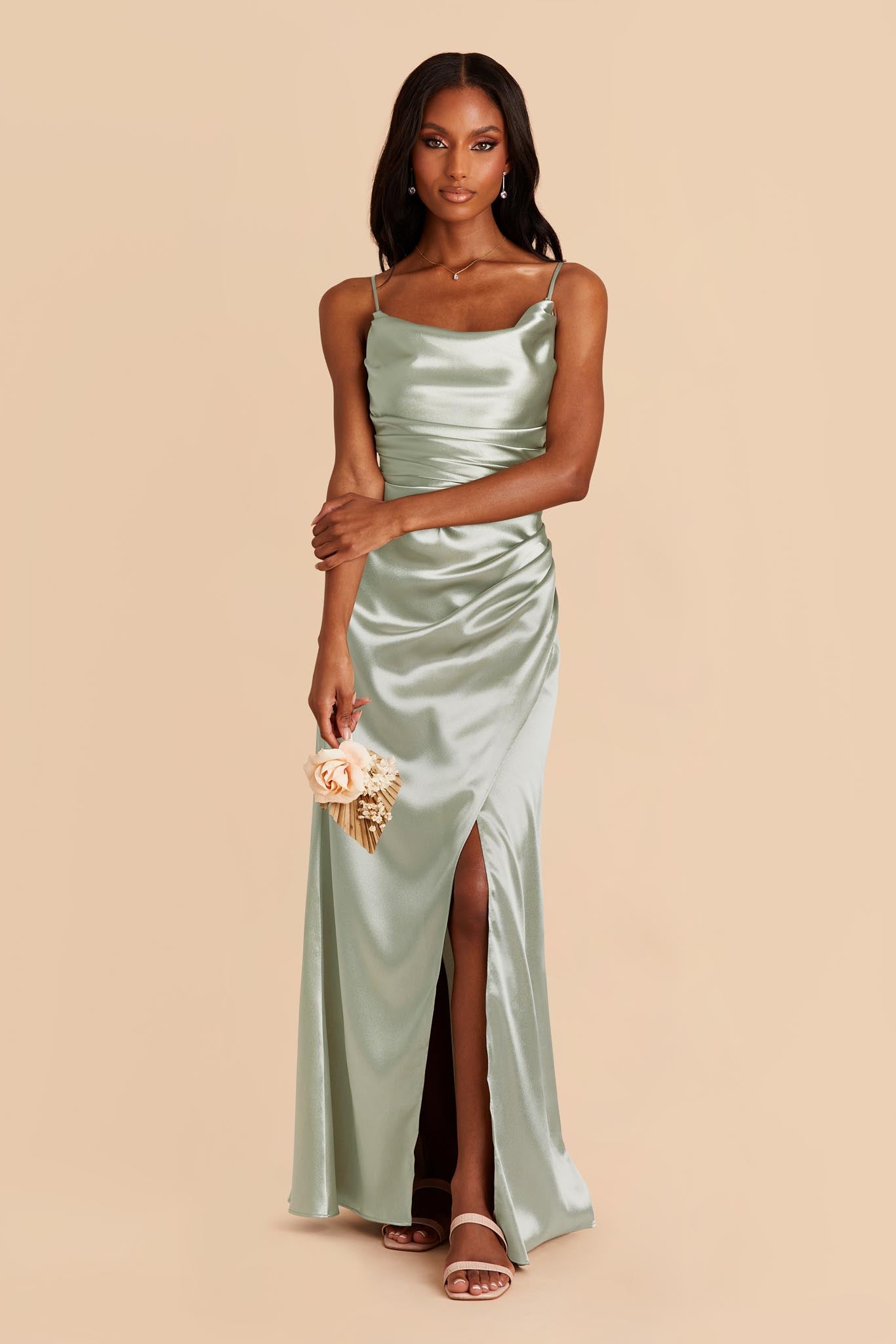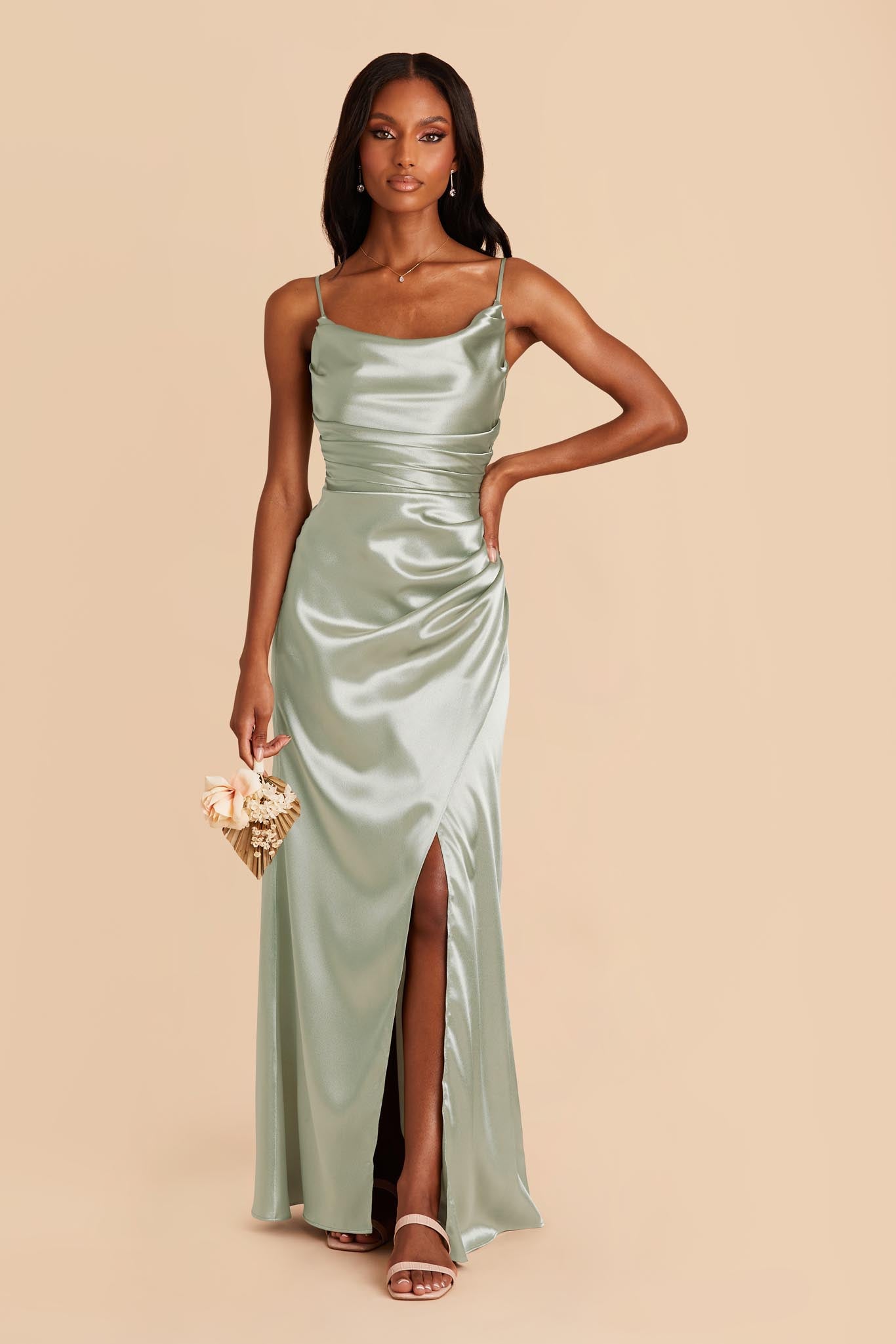 If our Lisa Satin Midi is the young, fun-loving sister, this floor-length one is the elegant, grown-up sis. She still flaunts the same signature '90s cowl neck, but this Lisa is a head-turning statuesque beauty. We see this satin bridesmaid dress paired with a chic little clutch, and a dainty pearl necklace to accentuate your collarbone.