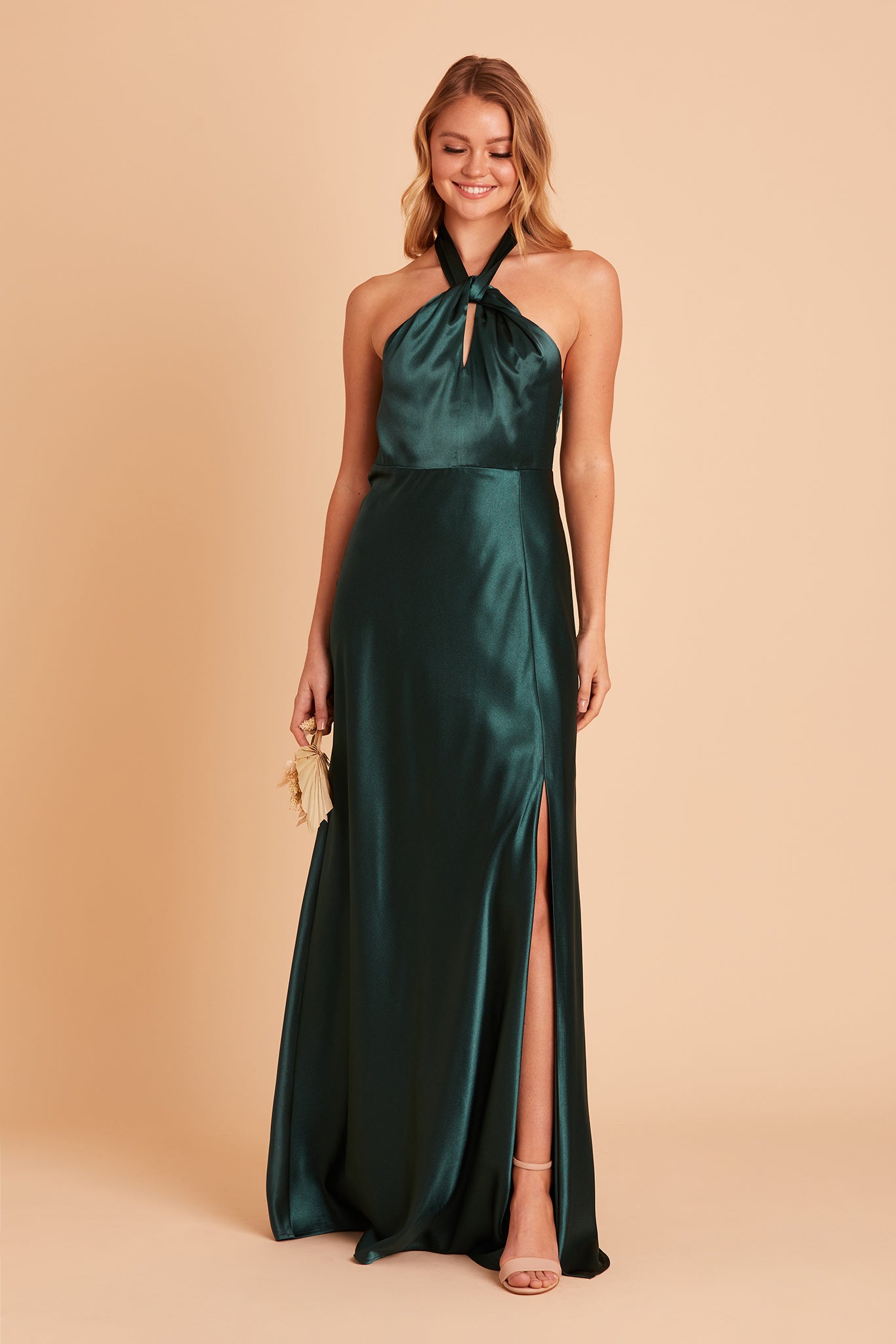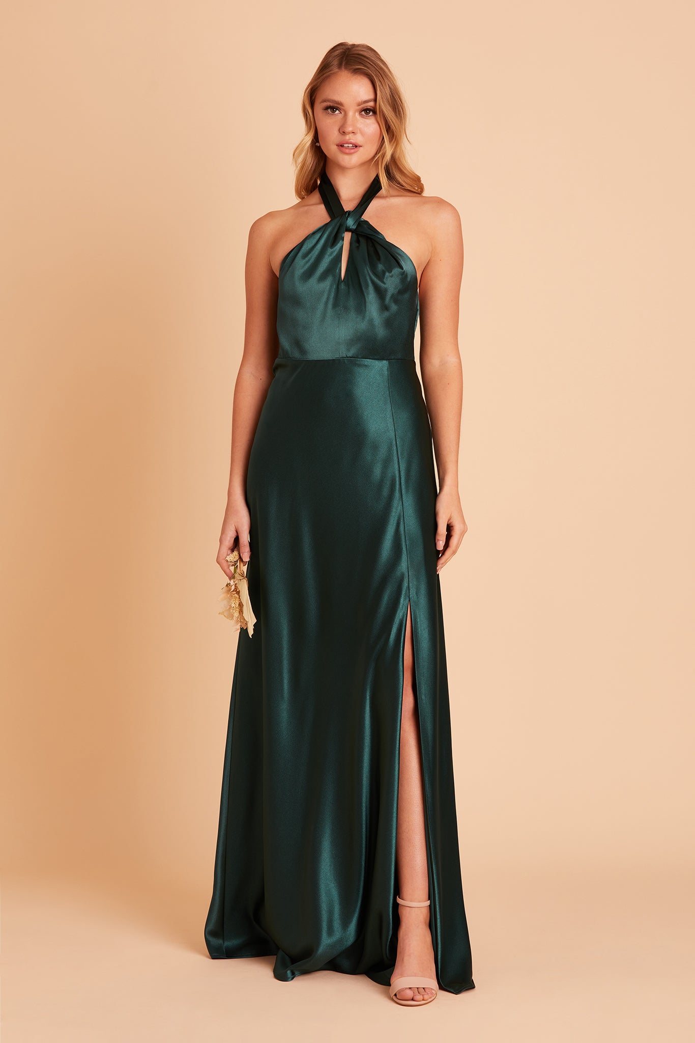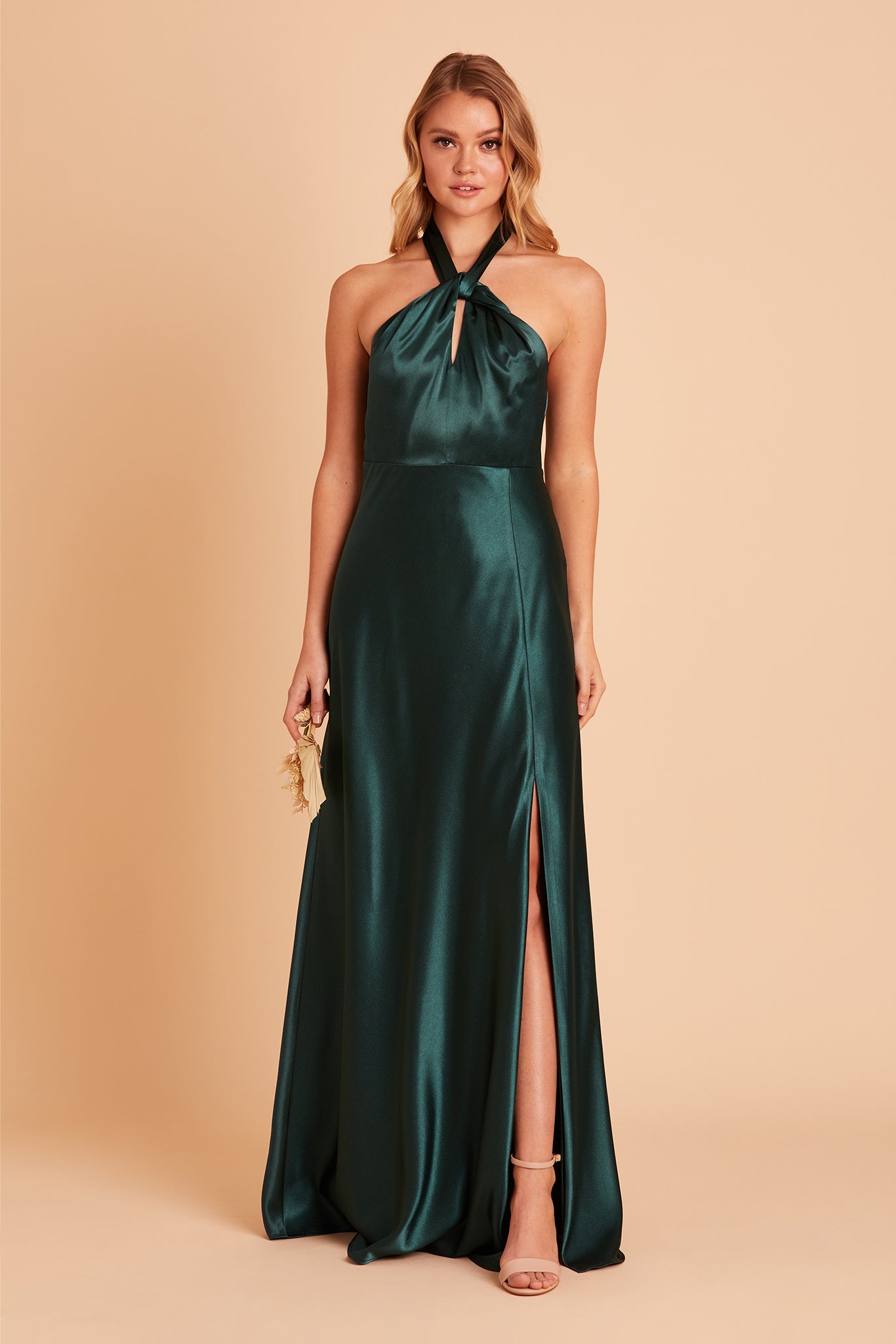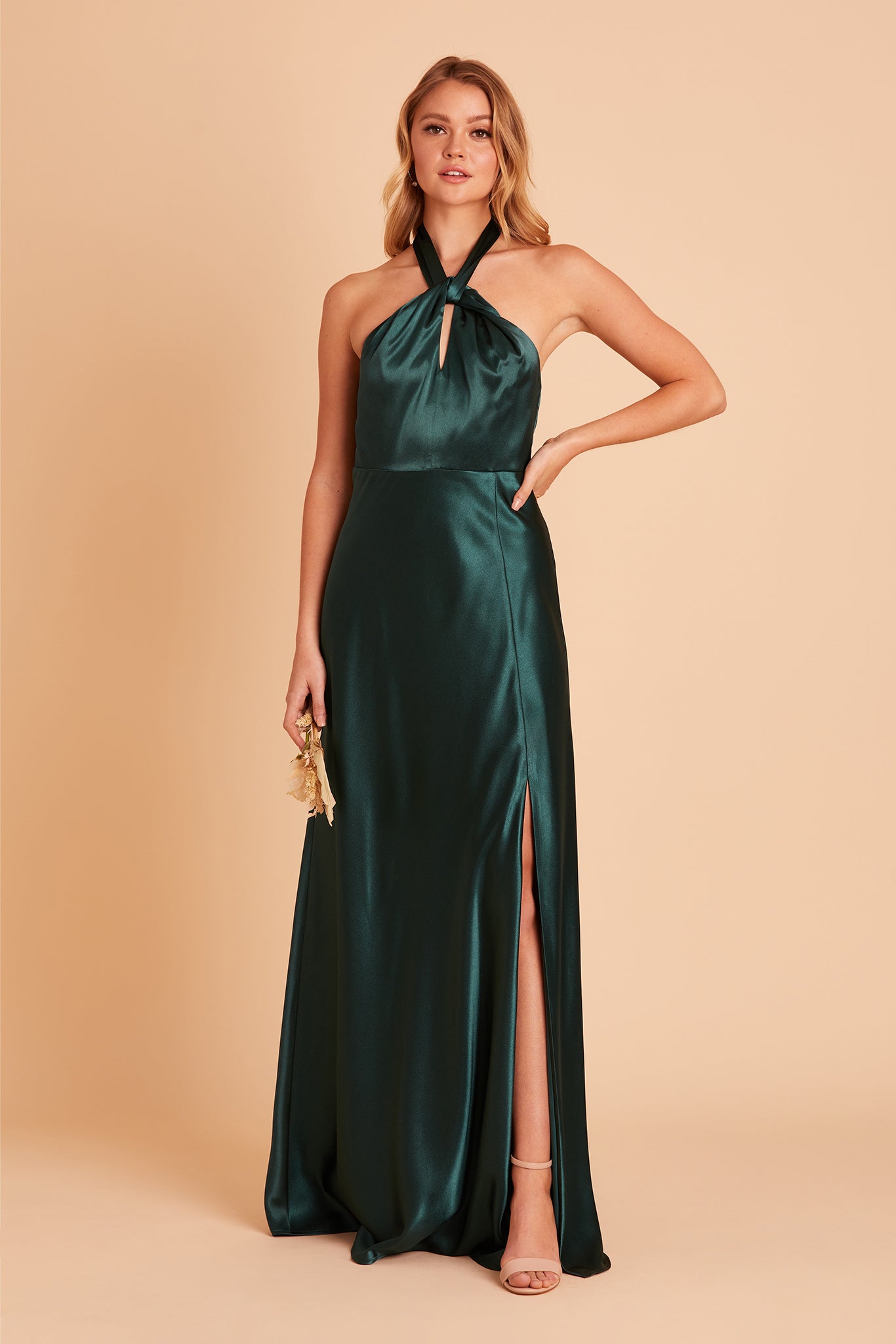 Your wedding will look like a star-studded event with your bridal party wearing this twist-front halter satin bridesmaid dress. The lustrous fabric of this floor-length gown makes each color look rich and regal while the halter style creates an alluring look that's on par with an A-list Hollywood star. We love this bridesmaid dress paired with a low bun that softens the cool, modern style while showing off the neckline.