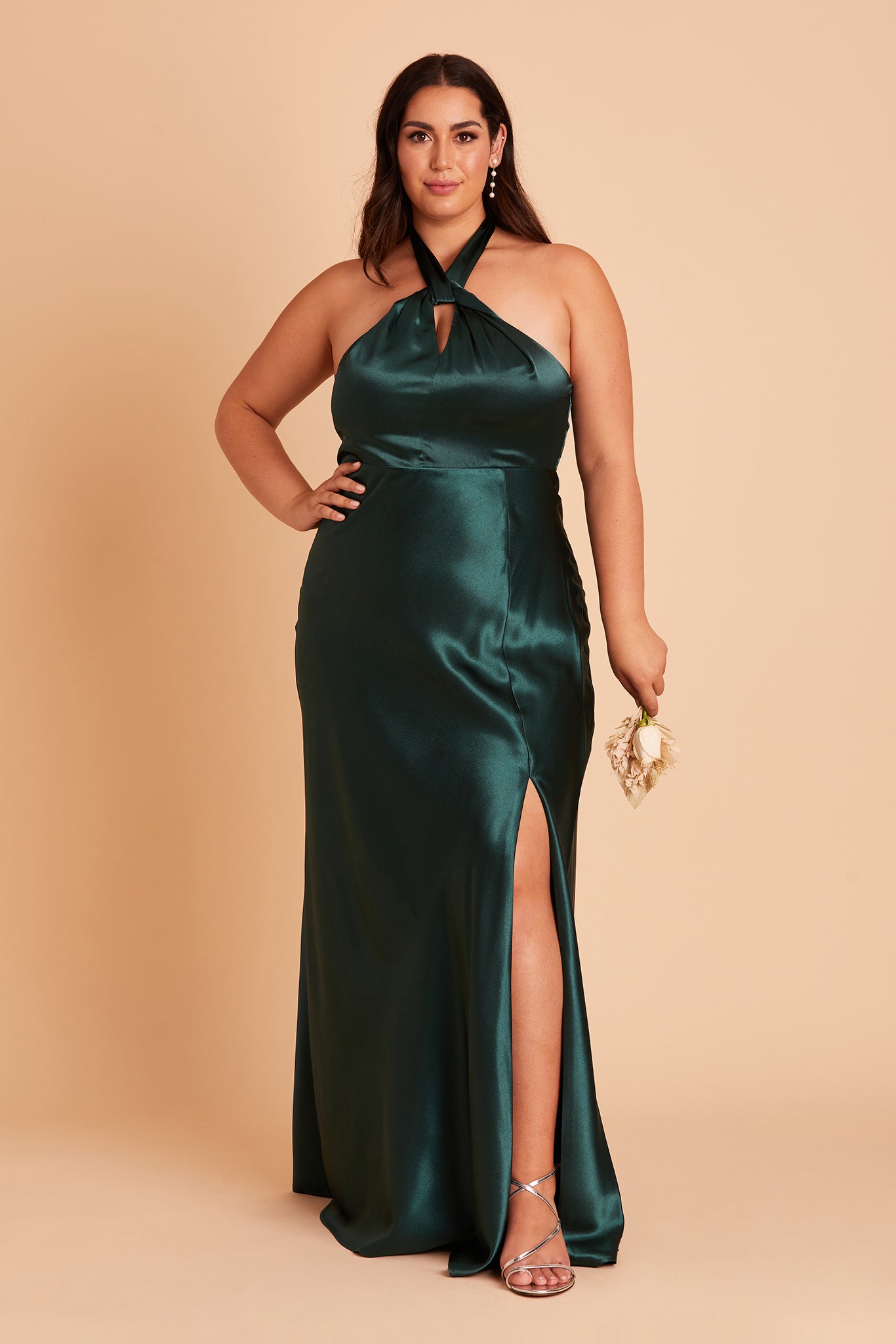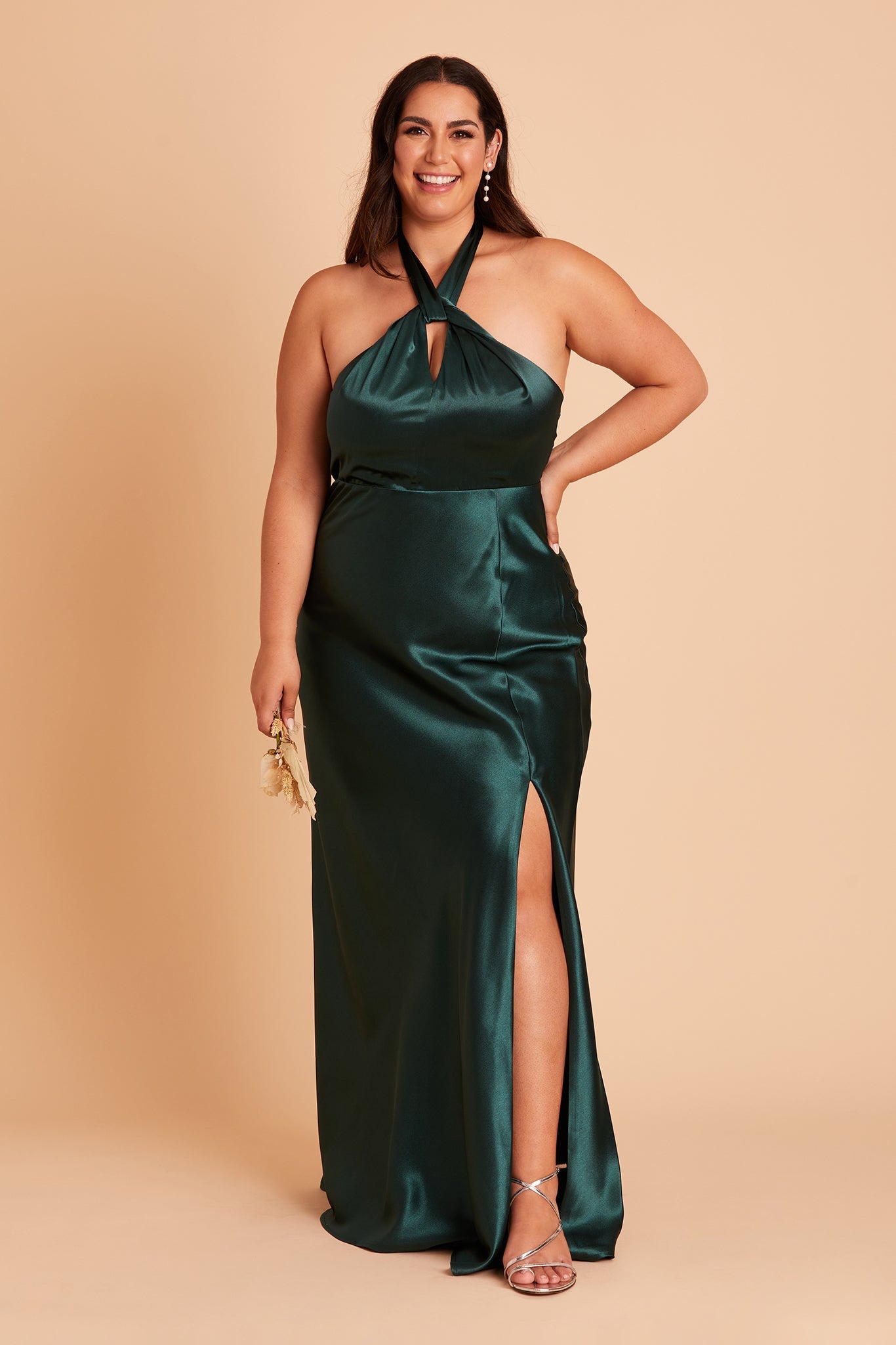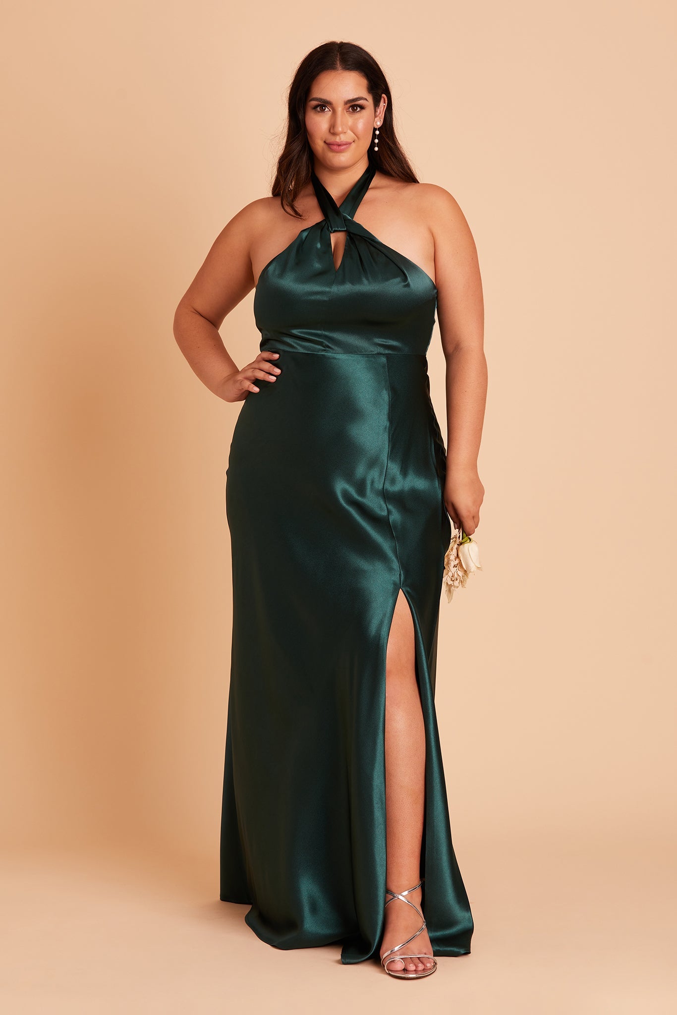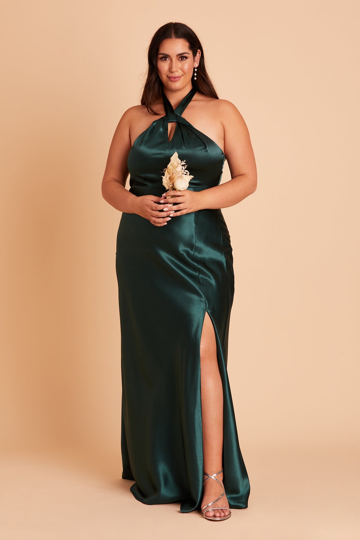 Your wedding will look like a star-studded event with your bridal party wearing this twist-front halter satin bridesmaid dress. The lustrous fabric of this floor-length gown makes each color look rich and regal while the halter style creates an alluring look that's on par with an A-list Hollywood star. We love this bridesmaid dress paired with a low bun that softens the cool, modern style while showing off the neckline.